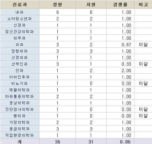 Áø·á°ú Á¤¿ø Áö¿ø °æÀï·ü ºñ°í ³»°ú 6 4 0.67 ¹Ì´Þ ¼Ò¾ÆÃ»¼Ò³â°ú 4 4 1.00 ¡¡ ½Å°æ°ú 1 1 1.00 ¡¡2014-12-03 18:06:07