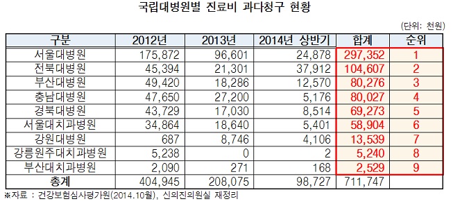 ±¹³» À¯¼ö ±¹¸³´ëº´¿øµéÀÌ È¯ÀÚ¿¡°Ô Áø·áºñ¸¦ °ú´Ùû±¸ ÇØ¿Ô´Ù´Â ÁÖÀåÀÌ Á¦±âµÆ´Ù. »õ´©¸®´ç ½ÅÀÇÁø ÀÇ¿øÀº 23ÀÏ ±¹È¸ ±³À°¹®2014-10-23 08:42:00