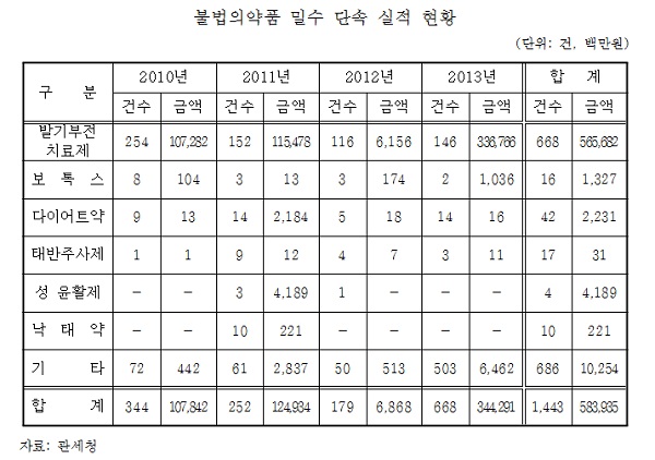 ÃÖ±Ù 4³â °£ ¹Ð¼öµÈ ºÒ¹ýÀǾàǰ Áß ºñ¾Æ±×¶ó µî ¹ß±âºÎÀüÄ¡·áÁ¦°¡ 97%¸¦ Â÷ÁöÇß´Ù. »õ´©¸®´ç Á¤Èñ¼ö ÀÇ¿ø(±¹È¸ ±âȹÀçÁ¤À§¿øÈ¸2014-10-13 18:34:18