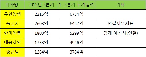 ÃÖ±Ù ±¹³» »óÀ§ 5À§±Ç Á¦¾à»çµéÀÇ 3ºÐ±â ¸ÅÃâ ½ÇÀûÀÌ °ø½ÃµÈ °¡¿îµ¥ °¢ ȸ»çµéÀÇ ½ÇÀû ¡®¸í¾Ï¡¯ÀÌ ¾ù°¥¸®´Â ¸ð½ÀÀÌ´Ù. 2013-10-30 20:00:00