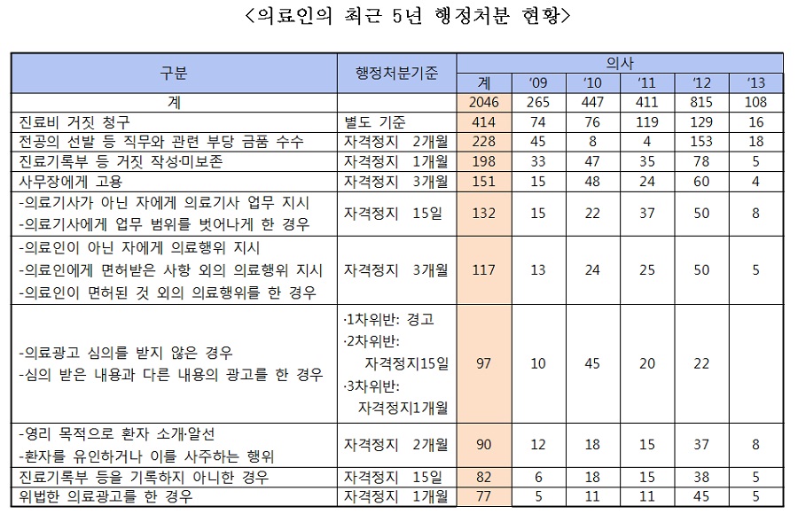 Áö³ 5³â °£ ÃÑ 2046¸íÀÇ Àǻ簡 ÇàÁ¤Ã³ºÐÀ» ¹ÞÀº °ÍÀ¸·Î ³ªÅ¸³µ´Ù. º¸°Çº¹ÁöºÎ°¡ ±¹È¸ º¸°Çº¹ÁöÀ§¿øÈ¸ ¼Ò¼Ó »õ´©¸®´ç ±èÁ¤·Ï2013-10-18 12:00:00