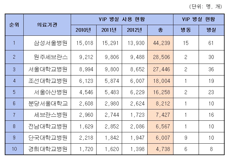 Áö³ 3³â°£ ¿ì¸®³ª¶ó¿¡¼ °¡Àå ¸¹Àº »ç¶÷µéÀÌ ÀÌ¿ëÇÑ VIP º´½ÇÀº »ï¼º¼¿ïº´¿ø º´½Ç·Î ³ªÅ¸³µ´Ù. ±¹È¸ º¸°Çº¹ÁöÀ§¿øÈ¸ ¼Ò¼Ó ¹Î2013-10-10 12:00:00