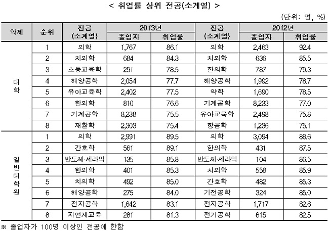 ÀÇÇÐ, Ä¡ÀÇÇÐ, °£È£ÇÐ °è¿ µî º¸°ÇÀÇ·á °ü·Ã Çаú Á¹¾÷ÀÚµéÀÌ Ãë¾÷·üÀÌ °¡Àå ³ôÀº ¼öÁØÀÎ °ÍÀ¸·Î ³ªÅ¸³µ´Ù. ±³À°ºÎ(Àå°ü ¼³²2013-08-29 11:52:15