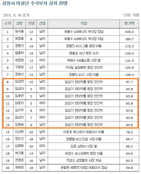 Çѹ̾àǰ ÀÓ¼º±â ȸÀåÀÇ ¼ÕÁÖ 7¸íÀÌ ±¹³» »óÀå»ç ¹Ì¼º³â ÁֽĺÎÀÚ »óÀ§ 20À§±Ç¿¡ ¼ÓÇÑ °ÍÀ¸·Î ³ªÅ¸³ª °ü½ÉÀÌ ½ò¸°´Ù. 2013-08-19 20:00:00