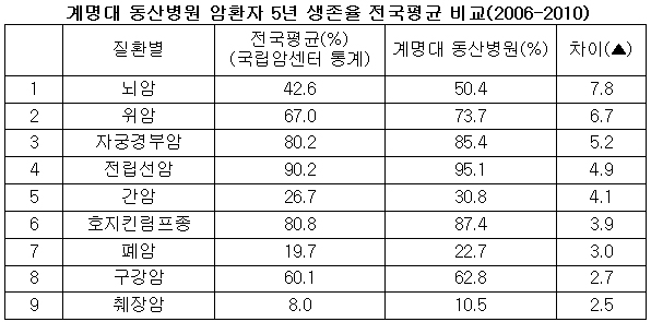 Áö¿ª ´ëÇк´¿øÀÇ ¾ÏȯÀÚ »ýÁ¸À²ÀÌ Àü±¹ Æò±Õº¸´Ù ³ô¾Æ ÈÁ¦°¡ µÇ°í ÀÖ´Ù. °è¸í´ëÇб³ µ¿»êº´¿øÀº 2006³â~2010³â±îÁö ¾Ï µî...2013-06-19 11:49:49