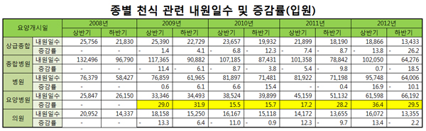 Á¾ÇÕº´¿ø±Þ°ú º´¿ø±Þ¿¡¼ Áø·á ¹Þ´ø õ½ÄȯÀÚµéÀÌ ÃÖ±Ù ¿ä¾çº´¿ø¿¡¼ Ä¡·á¹Þ´Â Ƚ¼ö°¡ ´Ã°í ÀÖ´Â °ÍÀ¸·Î È®ÀεƴÙ. °Ç°º¸Çè.2013-05-19 20:00:00
