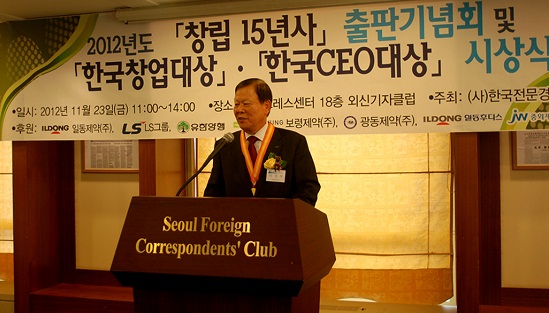 Àϵ¿Á¦¾à â¾÷ÀÚÀΠͺ À±¿ë±¸ ȸÀåÀÌ Áö³ 23ÀÏ Çѱ¹ CEOÇÐȸ(ȸÀå À̵¿±â)°¡ ÁÖÃÖÇÑ ¡®Çѱ¹Ã¢¾÷´ë»ó¡¯¿¡¼ ´ë»óÀ» ¼ö»ó.2012-11-25 13:23:01