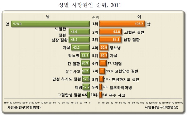 2011³â »ç¸Á¿øÀÎ Åë°è °á°ú 3´ë »ç¸Á¿øÀÎÀÎ ¾Ï, ³úÇ÷°ü ¹× ½ÉÀåÁúȯÀÌ ÃÑ »ç¸ÁÀÚÀÇ 47.4%ÀÎ °ÍÀ¸·Î ³ªÅ¸³µ´Ù. ÀÌ ¹Û¿¡´Â ÀÚ»ì,2012-09-13 11:44:08