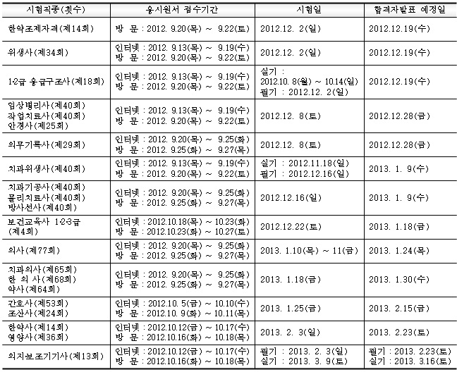 9¿ù 13ÀÏ Á¦34ȸ À§»ý»ç ¹× Á¦18ȸ 1¤ý2±Þ ÀÀ±Þ±¸Á¶»ç ÀÀ½Ã¿ø¼ Á¢¼ö¸¦ ½ÃÀÛÀ¸·Î ¡®2012³âµµ ÇÏ¹Ý±â ¹× 2013³âµµ »ó¹Ý±â º¸°ÇÀÇ.2012-07-27 11:34:53