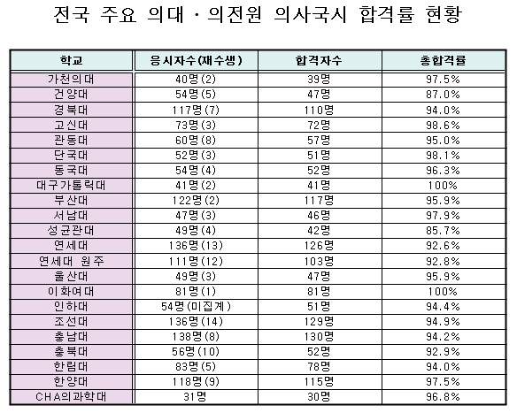 Á¦76ȸ Àǻ籹°¡½ÃÇè¿¡¼ ÀÌÈ¿©´ë ÀÇÇÐÀü¹®´ëÇпø°ú ´ë±¸°¡Å縯´ë Àǰú´ëÇÐÀÌ 100% ÇÕ°Ý·üÀ» ³½ ¹Ý¸é ¼º±Õ°ü´ë°¡ 85.7%·Î ü¸é.2012-01-25 03:58:10