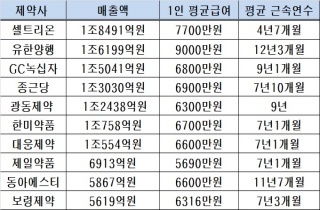 [µ¥Àϸ®¸Þµð ¾çº¸Çý ±âÀÚ] Áö³ÇØ ¸ÅÃâ 10À§ ±¹³» Á¦¾à»ç °¡¿îµ¥ Á÷¿øµéÀÇ Æò±Ù ±Ù¼Ó¿¬¼ö°¡ °¡Àå ±ä °÷Àº 'À¯ÇѾçÇà'À̾ú´Ù. 1ÀÎ2021-03-24 05:28:44