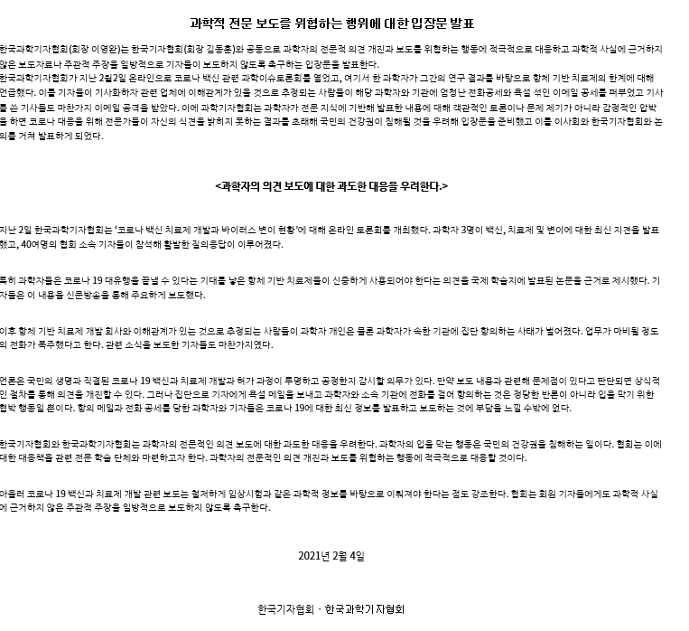 [µ¥Àϸ®¸Þµð ½ÅÁöÈ£ ±âÀÚ] Çѱ¹°úÇбâÀÚÇùȸ°¡ 4ÀÏ “°úÇÐÀÚ ÀÇ°ß º¸µµ¿¡ ´ëÇÑ °úµµÇÑ ´ëÀÀÀ» ¿ì·ÁÇÑ´Ù”°í ¹àÇû´Ù. 2021-02-04 17:45:34