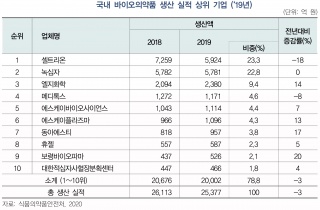 [µ¥Àϸ®¸Þµð ¾çº¸Çý ±âÀÚ] 2019³â ±¹³» ¹ÙÀÌ¿ÀÀǾàǰ »ý»ê½ÇÀû 1À§ ±â¾÷Àº '¼¿Æ®¸®¿Â'À̾ú´Ù. Àü³â ´ëºñ »ý»ê½ÇÀûÀÌ 18% °¨¼ÒÇß.2021-01-09 06:40:00