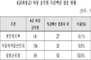 [µ¥Àϸ®¸Þµð °íÀç¿ì ±âÀÚ] º¸°Çº¹ÁöºÎ 4±Þ ÀÌ»ó °ø¹«¿øÀÇ µ¶°¨¹é½Å Á¢Á¾·üÀÌ 20%¿¡µµ ¹ÌÄ¡Áö ¸øÇÏ´Â °ÍÀ¸·Î ³ªÅ¸³µ´Ù. ¾Õ¼ .2020-11-02 11:03:07